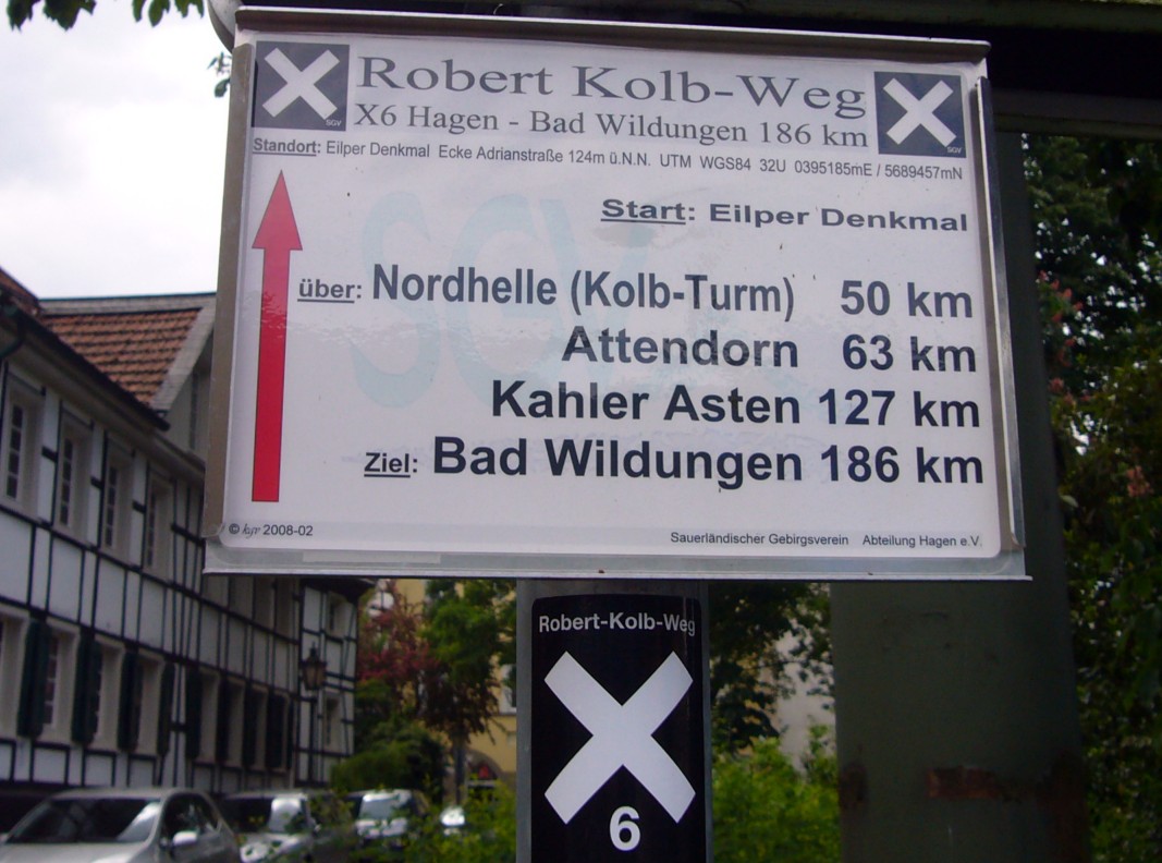 Hier sollte der Weg laut Karte eigentlich über die Volmebrücke zum Bahnhof führen, doch der Weg wendet sich genau entgegengesetzt hinauf nach Ostendorf. Die B 229 wird überquert, danach wandert man durch eine Wohnstraße und anschließend in den Wald. Nach stetigem Aufstieg trifft man bald auf den Hauptwanderweg X 7. Gemeinsam wandert man nach rechts und verlässt bei Grünewald den Wald. Hier stößt von rechts auch noch der Hauptwanderweg X 20 hinzu, so dass sich für wenige Meter das seltene Bild von drei gemeinsamen X-Wegen ergibt. Bereits hinter dem Bauernhof zweigt man aber mit X 20 nach links von der Straße ab, während X 7 geradeaus weiter führt (km 29,5).